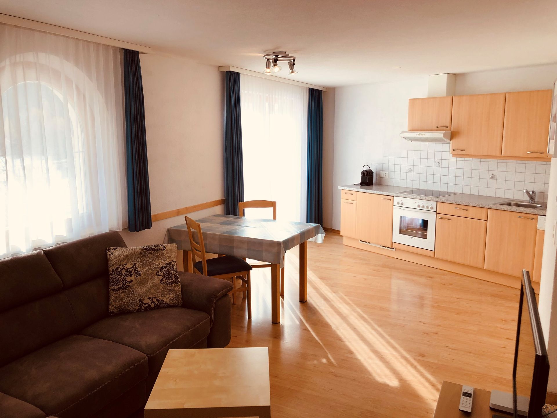Die Ausstattung umfasst Swisscom-TV/Radio, Geschirrspüler, Backofen, Kühlschrank mit Gefrierfach sowie eine Kaffeemaschine (wahlweise Nespresso oder Filter).